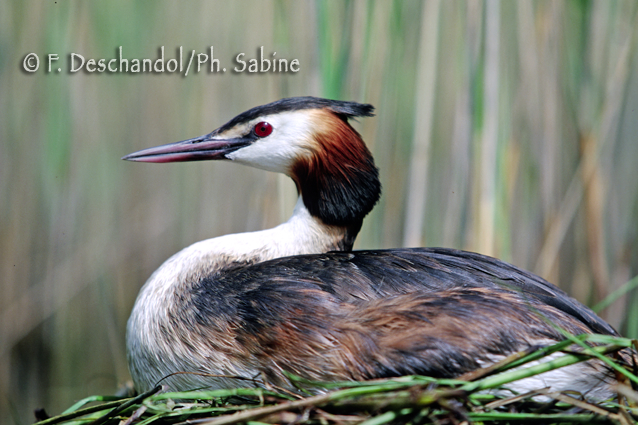 : Grèbe huppé (Podiceps cristatus), au nid, Baie de Seine (76), France.