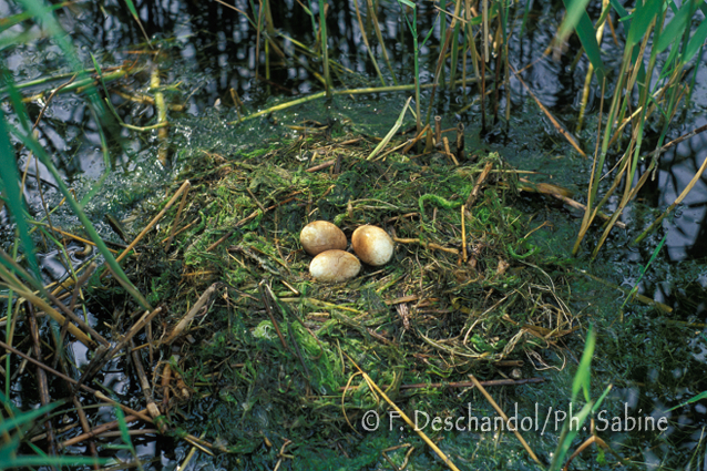 : Grèbe huppé (Podiceps cristatus), nid et oeufs, Baie de Seine (76), France.