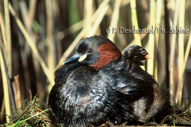 : Grèbe castagneux (Tachybaptus ruficollis), au nid avec son jeune sur le dos, Baie de Seine (76), France.