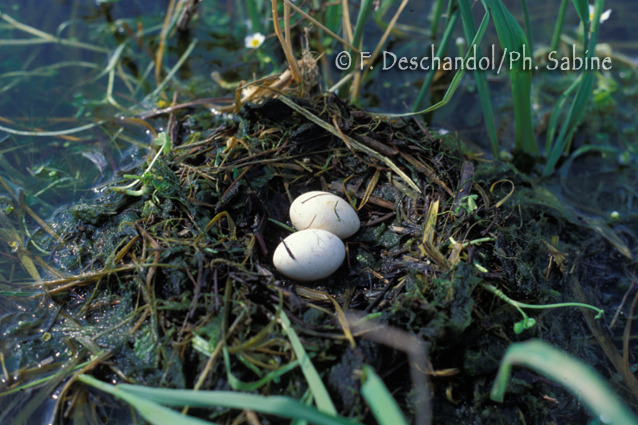 : Grèbe castagneux (Tachybaptus ruficollis), nid et oeufs en début de ponte, Baie de Seine (76), France.