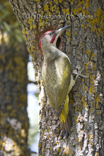 : Pic vert (Picus viridis sharpei), mâle, forme espagnole, Vallée d'Embid, Espagne.