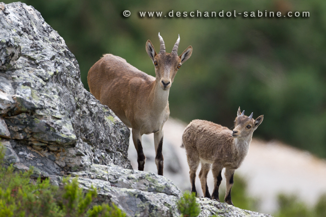 : Bouquetins d'Espagne (Capra pyrenaica), femelle et jeune, Peña de Francia, Espagne.
