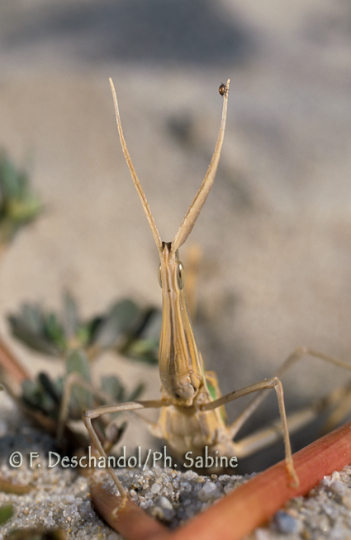 : Truxale occitane (Acrida ungarica mediterranea), femelle, forme brune, Parc de Doñana, Espagne.