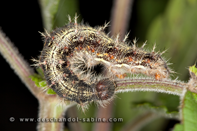 : Belle-Dame (Cynthia cardui), chenille 5ème stade, génération issue de migrateurs, Rogerville (76), France.