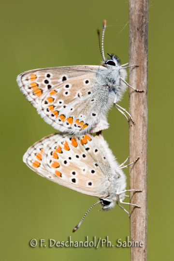 : Azurés de la Bugrane (Polyommatus icarus), accouplement, Sandouville (76), France.