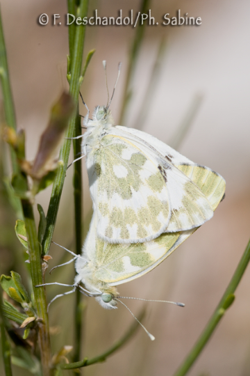 : Marbrés-de-vert (Pontia daplidice), accouplement, Aiguines (83), France.