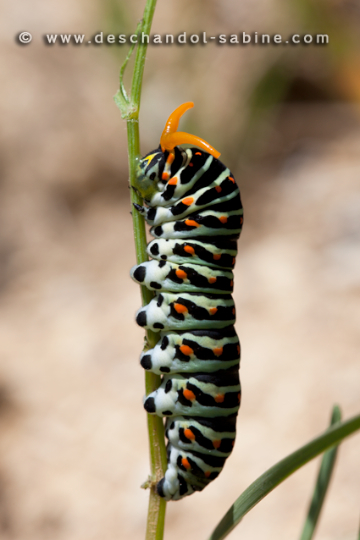 : Machaon (Papilio machaon), chenille 5ème stade, attitude de défense, Nantes (44), France.