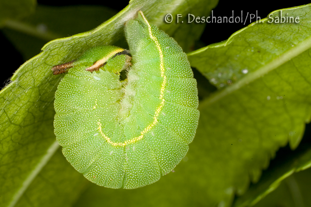 : Nymphale de l'Arbousier (Charaxes jasius), chenille en cours de nymphose, St Raphaël (83), France.