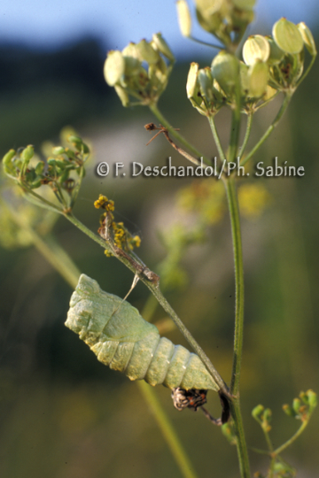 : Machaon (Papilio machaon), chrysalide récente, Baie de Seine (76), France.