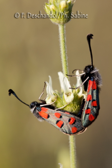 : Zygènes de l'Esparcette (Zygaena rhadamanthus), accouplement, Lorca, Espagne.