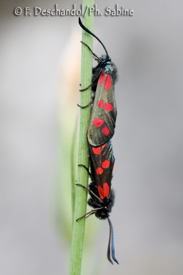 : Zygènes de la Filipendule (Zygaena filipendulae), accouplement, Boltigen, Suisse.