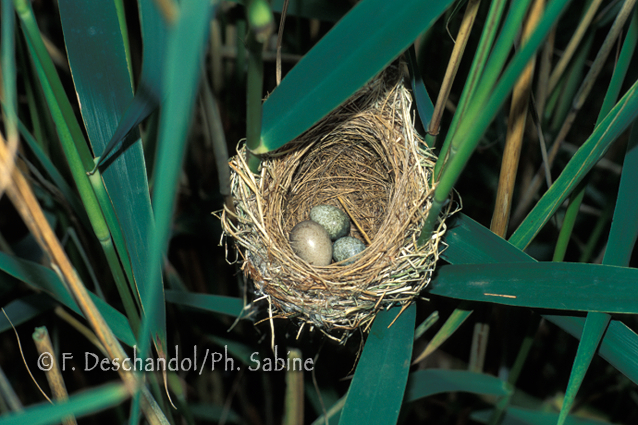 : Rousserolle effarvatte (Acrocephalus scirpaceus), nid et oeufs avec un oeuf de Coucou gris (Cuculus canorus), Baie de Seine (76), France.