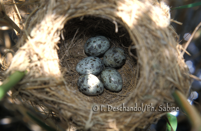 : Rousserolle turdoïde (Acrocephalus arundinaceus), nid et oeufs, Parc de Doñana, Espagne.