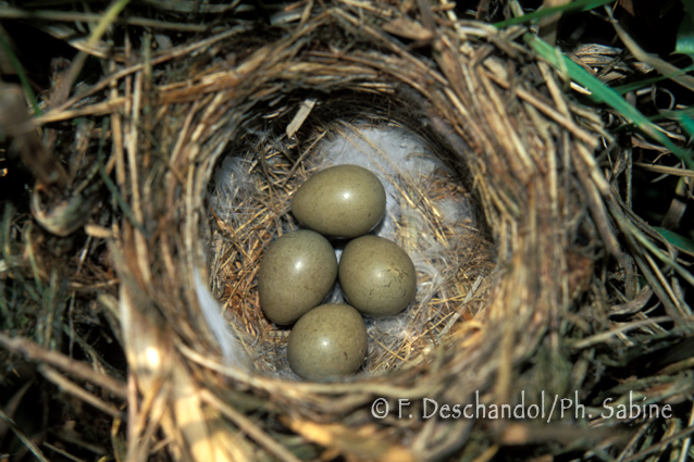 : Phragmite des joncs (Acrocephalus schoenobaenus), nid et oeufs, Baie de Seine (76), France.
