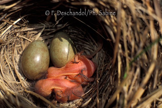 : Gorgebleue à miroir blanc (Luscinia svecica), nid et oisillon, Baie de Seine (76), France.