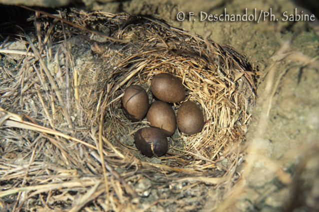 : Pipit farlouse (Anthus pratensis), nid et oeufs, Baie de Seine (76), France.