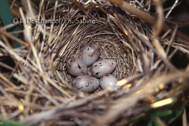 : Bruant des roseaux (Emberiza schoeniclus), nid et oeufs, Baie de Seine (76), France.