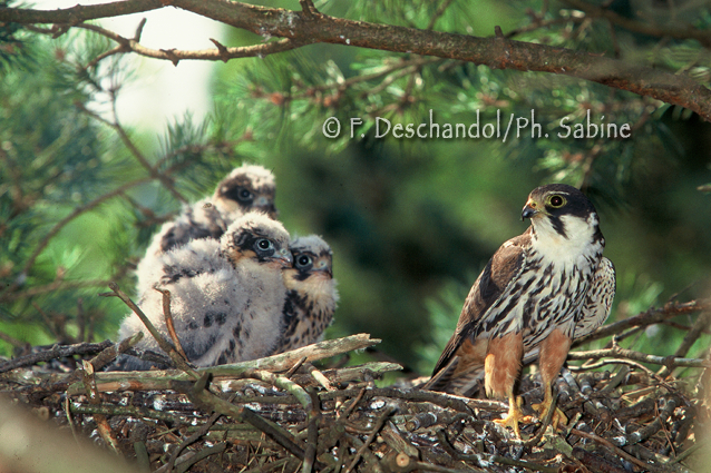 : Faucon hobereau (Falco subbuteo), adulte et jeunes au nid, Bois des Loges (76), France.