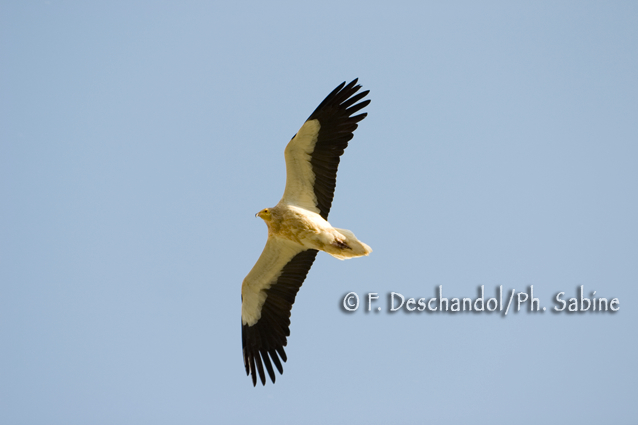 : Vautour percnoptère (Neophron percnopterus), en vol, Vallée d'Embid, Espagne.