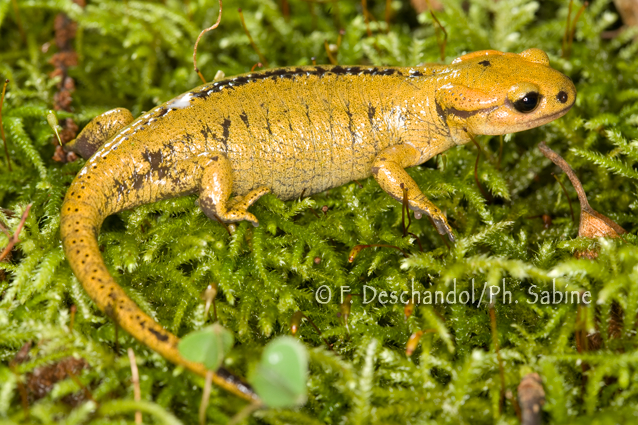 : Salamandre tachetée (Salamandra salamandra alfredschmidti), femelle gravide, Rio Tendi, Espagne.