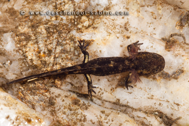 : Salamandre tachetée (Salamandra salamandra almanzoris), larve, Sierra de Gredos, Espagne.