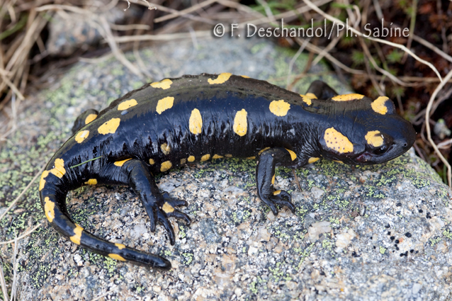 : Salamandre tachetée (Salamandra salamandra almanzoris), Sierra de Gredos, Espagne.