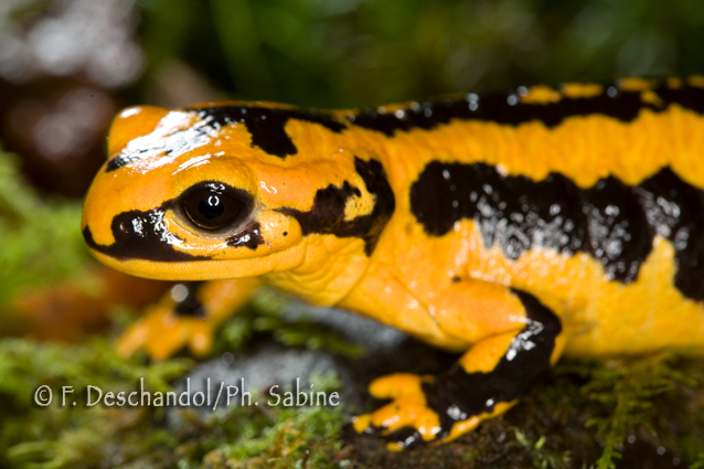 : Salamandre tachetée (Salamandra salamandra fastuosa), femelle gravide, Ucieda, Espagne.