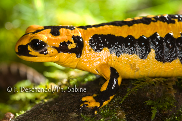 : Salamandre tachetée (Salamandra salamandra fastuosa), femelle gravide, Ucieda, Espagne.