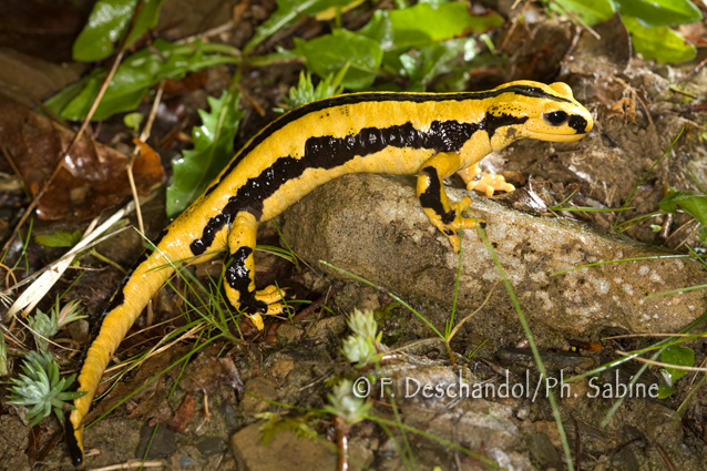 : Salamandre tachetée (Salamandra salamandra fastuosa), Forêt d'Iraty (64), France.