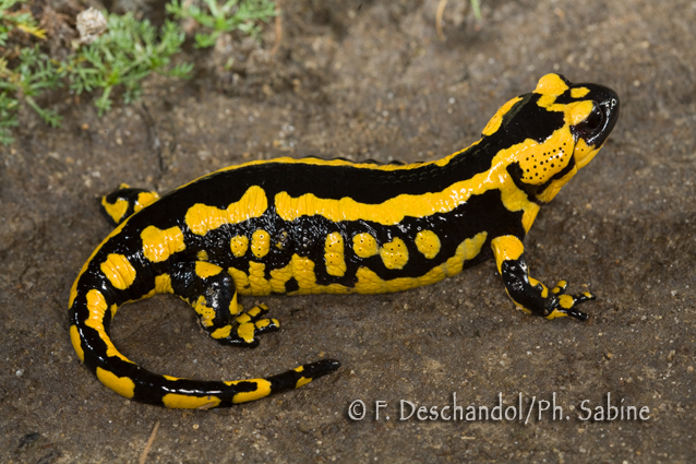 : Salamandre tachetée (Salamandra salamandra fastuosa x bejarae), Santa Gadea de Alfoz, Espagne.