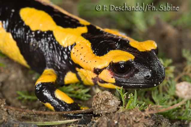 : Salamandre tachetée (Salamandra salamandra fastuosa x bejarae), Santa Gadea de Alfoz, Espagne.
