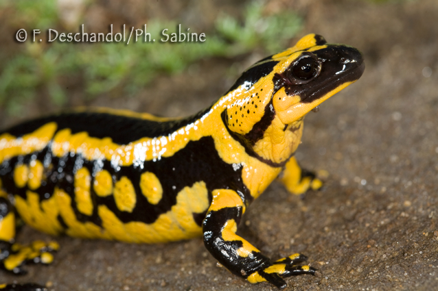 : Salamandre tachetée (Salamandra salamandra fastuosa x bejarae), Santa Gadea de Alfoz, Espagne.