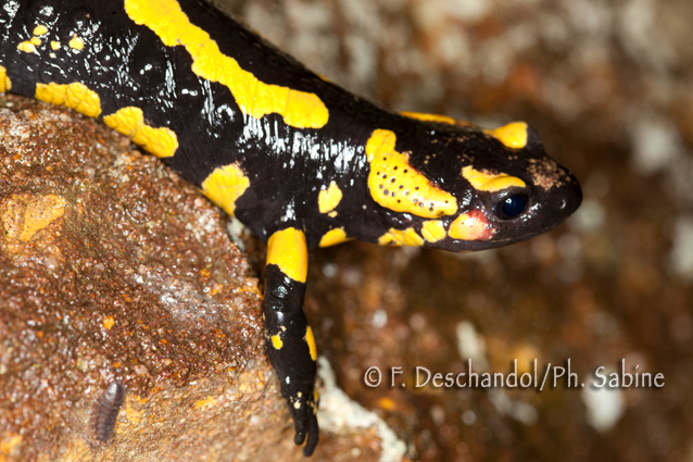 : Salamandre tachetée (Salamandra salamandra fastuosa x bejarae), femelle, Santa Gadea de Alfoz, Espagne.