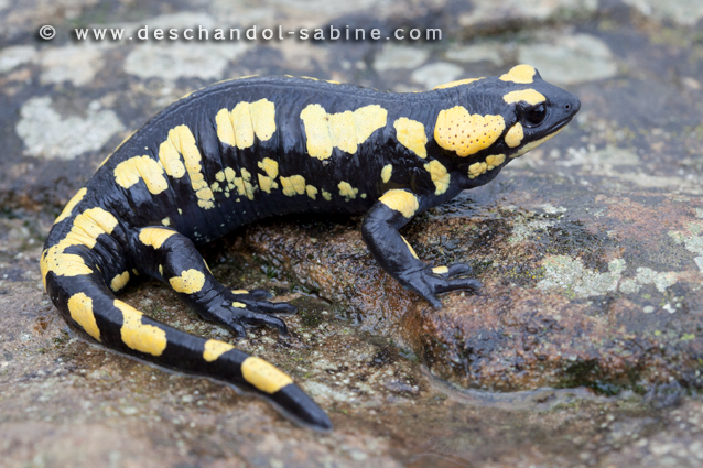 : Salamandre tachetée (Salamandra salamandra longirostris), femelle gravide, Los Alcornocales, Espagne.