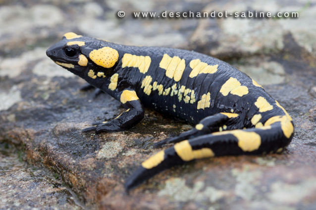 : Salamandre tachetée (Salamandra salamandra longirostris), femelle gravide, Los Alcornocales, Espagne.
