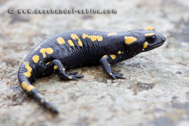 : Salamandre tachetée (Salamandra salamandra longirostris), jeune, Los Alcornocales, Espagne.