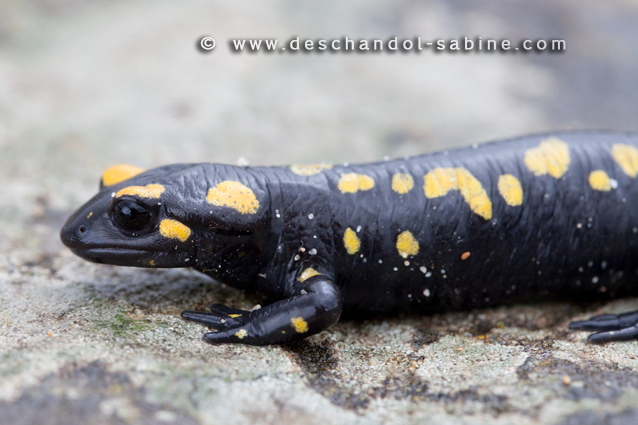 : Salamandre tachetée (Salamandra salamandra longirostris), jeune, Los Alcornocales, Espagne.