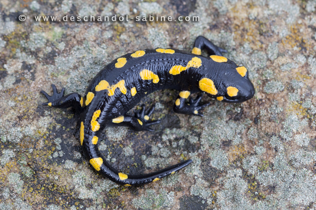 : Salamandre tachetée (Salamandra salamandra longirostris), jeune, Los Alcornocales, Espagne.