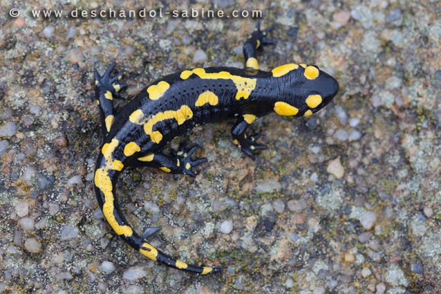 : Salamandre tachetée (Salamandra salamandra longirostris), jeune, Los Alcornocales, Espagne.