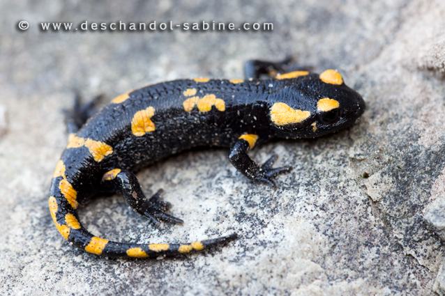 : Salamandre tachetée (Salamandra salamandra longirostris), jeune, Los Alcornocales, Espagne.