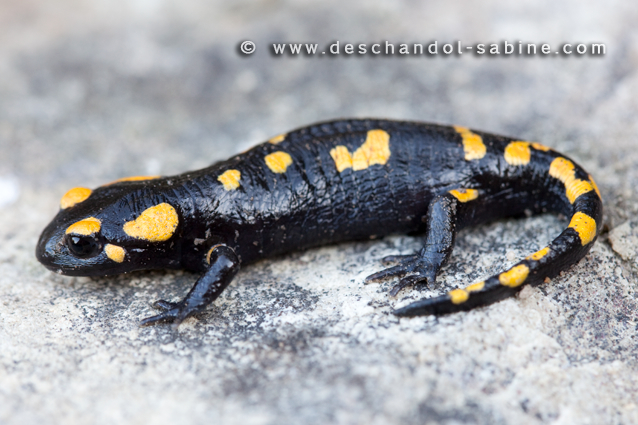 : Salamandre tachetée (Salamandra salamandra longirostris), jeune, Los Alcornocales, Espagne.