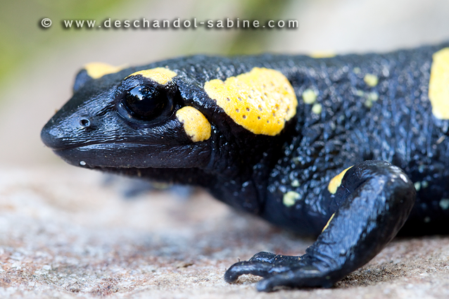 : Salamandre tachetée (Salamandra salamandra longirostris), femelle gravide, Los Alcornocales, Espagne.