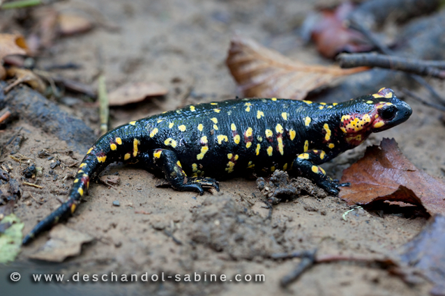 : Salamandre tachetée (Salamandra salamandra morenica), femelle gravide, Almonaster la Real, Espagne.
