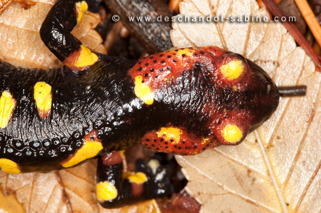 : Salamandre tachetée (Salamandra salamandra morenica), Almonaster la Real, Espagne.