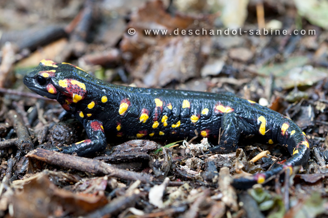 : Salamandre tachetée (Salamandra salamandra morenica), Cazalla de la Sierra, Espagne.