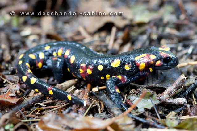 : Salamandre tachetée (Salamandra salamandra morenica), Cazalla de la Sierra, Espagne.