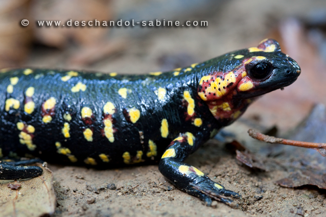 : Salamandre tachetée (Salamandra salamandra morenica), femelle gravide, Almonaster la Real, Espagne.