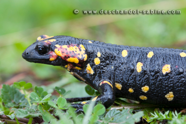 : Salamandre tachetée (Salamandra salamandra morenica), Jabugo, Espagne.