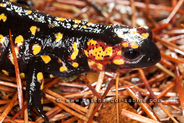 : Salamandre tachetée (Salamandra salamandra morenica), femelle gravide, Almonaster la Real, Espagne.