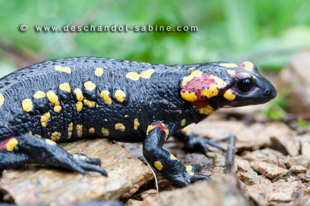 : Salamandre tachetée (Salamandra salamandra morenica), Jabugo, Espagne.